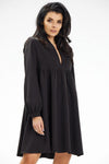 Mini dress on a stand-up collar with a deep neckline. It has long sleeves with cuffs fastened with press studs. The model is slightly fitted at the top and flared at the bottom. The proposal is ideal for christenings, birthdays or dates.