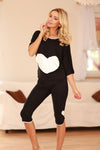 Girlish and light pyjamas made of viscose pleasant to the body. The top is a blouse with a loose cut. A pocket made of a large heart in a contrasting colour attracts attention. A smaller heart decorates one leg of the 3/4 length trousers, which is complemented by piping on both the shirt and the legs, alluding to hearts in a contrasting colour.