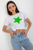 Women's T-shirt with short sleeves and a round neckline. Decorative print on the front.