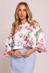 Short oversize sweater made of knit fabric with a print is the perfect choice for everyday stylizations with a touch of relaxation. It is characterized by wide 3/4 length sleeves, which give it an unusual look, and a boat neckline that subtly exposes the shoulders. Made of soft knit fabric, it provides comfort and ease of wearing throughout the day. The blouse was designed and sewn in Poland, guaranteeing high quality and meticulous workmanship. Perfect for pairing with jeans, a skirt, or sporty pants, suitable for both casual and more elegant occasions.