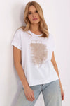 Casual women's blouse, perfect for everyday wear and work. Made of soft and stretchy cotton and elastane blend, it provides comfort and freedom of movement. The classic cut with a standard length, short sleeves, and a round neckline makes the blouse a versatile wardrobe staple. Decorated with an elegant embroidery with a print on the front, enriched with subtle zircons that add to its unique character. A great choice for women who value comfort and style.