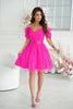 Beautiful Spanish-style dress with plunging tulle sleeves. The bottom of the creation is layered and flared, perfectly matching the top of the creation. A belt is attached to the model. The dress is fastened with a covered zipper. Available in juicy colors.