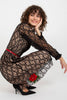 Lace dress with long sleeves, has a lining. The dress fastens with a covered zipper, with a belt at the waist. The dress is decorated with sewn-on flowers.