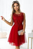A feminine dress with guipure and delicate tulle. The back of the dress was sewn from elastic gumonit, so it will fit most sizes. The dress comes in red color. Brand numoco basic.