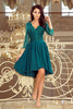 Asymmetrical green exclusive dress with longer back, 3/4 sleeves, neckline and lace. The skirt with a longer back will be perfect for dancing. Made in Poland.
