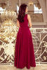 Cindy, a long dress with a front and back neckline. Made of pleasant-to-touch material in a fashionable burgundy colour. Fastened at the back with a covered zipper. Polish product. Brand numoco.
