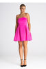 Dress with open shoulders. Figure-fitting top with a zipper on the back. Dress cut off at the waist with a metal plate with the company logo. Bottom with pleats discreetly flared.