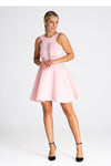 Dress with a fitted top exposing the shoulders. Under the neck, a thrifted neckline with a transparent vertical insert. Wide and flared bottom with marked waist, fastened at the back with a covered zipper.