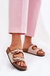 Women's flip-flops made of textile material are a great option for hot days. Two straps with buckles allow for easy adjustment to the foot, and the cork platform adds lightness and a modern look. The contoured insole ensures comfort for all-day wear, making these flip-flops a great choice for walks or vacation trips. A combination of comfort and style in one!