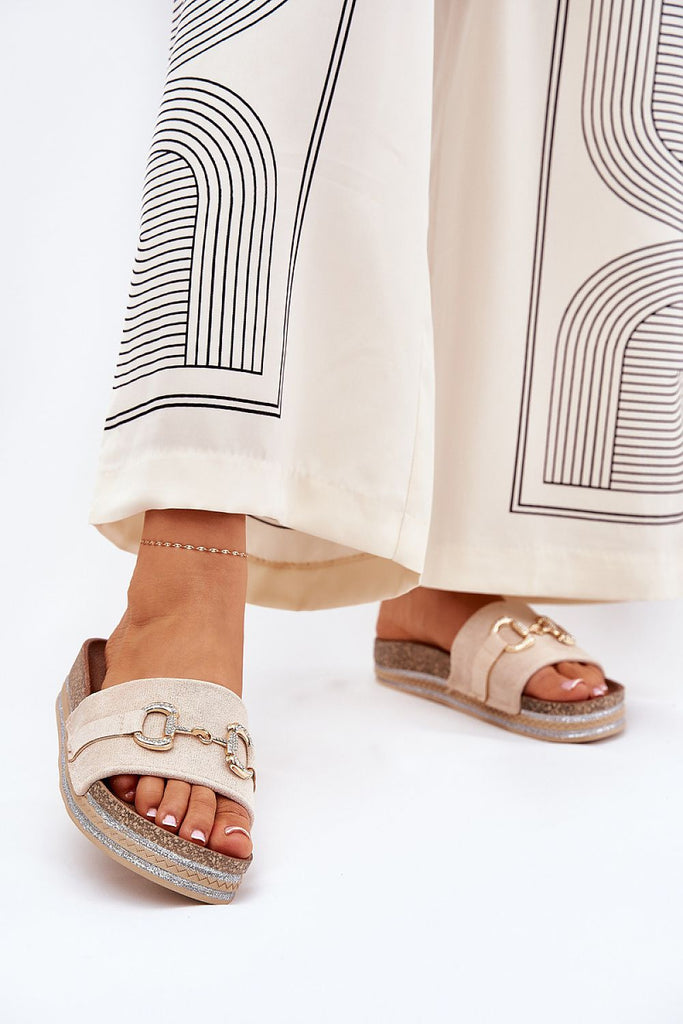 Slippers made of eco suede. At the front, there is a decorative gold detail that gives them a subtle glow. Set on a platform adorned with sequins, they add a touch of glamour to any outfit. The profiled insole ensures comfort all day long. Perfect for summer days, these slippers go well with dresses, skirts or pants, combining a fashionable look with functionality.