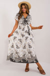 This everyday boho-style summer dress is the perfect choice for warm days. The maxi length flared cut provides freedom of movement, while the short sleeve and envelope neckline add elegance. The dress features a colorful print, which brings a cheerful and summer atmosphere. The dominant material is viscose, known for its breathability and wearing comfort. The tie belt allows you to accentuate the waist and fit your figure perfectly. It will work well for both casual and work wear, offering style and comfort in any situation.