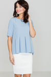 Slightly oversize form allows to cover up body imperfections. A line with a slightly longer back, short sleeves finished with a cuff. Round neckline, close to the neck, fastened at the back with a covered zipper. Convertible pleats at the front.