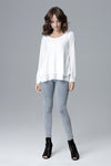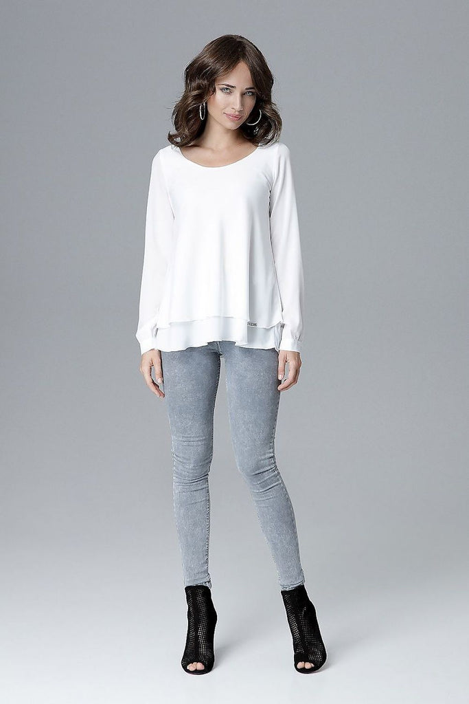 Long sleeve blouse with a half round neckline. A loose-fitting model, finished with an impressive frill. Perfect with tight jeans. ~Lycra 3...