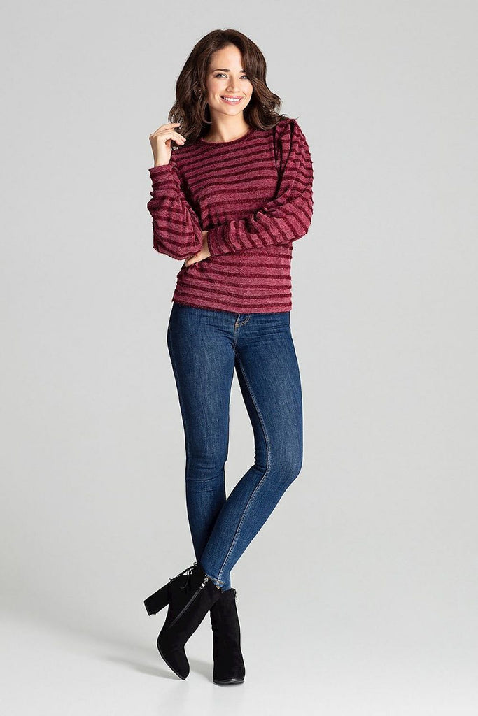 Maroon blouse with long buffet, kimono sleeves knitted with decorative horizontal stripes. Half-round neckline. Spandex 2 % Polyester 87 % Viscose 11...
