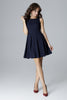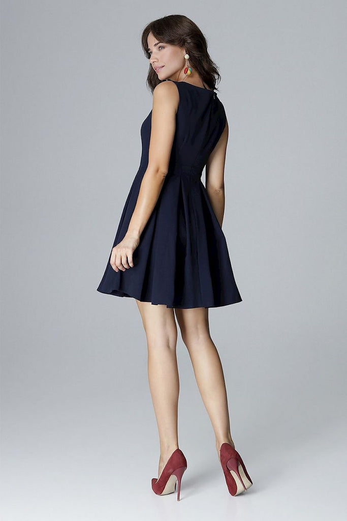 Sleeveless dress. With a fitted top and feminine, low neckline. Model cut at the waist with a flared, arranged in wide folds bottom. Dress perfectly emphasizes and slims the waist.