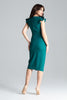 A knee-length cocktail dress with a front slit. Decorative frills on the sleeves, a crease on the right side adds chic and elegance. Unlined model, fastened at the back with a covered zip. Ideal for a business meeting or an important dinner.