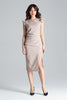 A knee-length cocktail dress with a front slit. Decorative frills on the sleeves, a crease on the right side adds chic and elegance. Model unlined, fastened at the back with a covered zipper. Ideal for a business meeting or an important dinner.