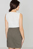 Skirt made of comfortable fabric. Pencil line with a slightly asymmetric cut. A distinctive accent is its asymmetrical opening at the front which creates a sexy and fashionable look. Belted model with a covered zipper at the back. Metal logo plate on the front, slanted pleats at the hip line.