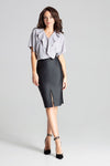 Black eco-leather midi pencil skirt. Fastened at the front with a decorative clasp and at the back with a covered zip. No pockets and no lining. A delicate slit in the middle at the front.