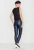 Waxed glossy knit trousers with long straight legs. The fabric is strong and elastic which makes them comfortable to wear. Pockets on the hip line, patch pockets at the back. Button and zipper at back yoke, belt loops at waist.
