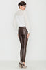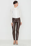 Waxed glossy knit trousers with long straight legs. The fabric is strong and elastic which makes them comfortable to wear. Pockets on the hip line, patch pockets at the back. Button and zipper at back yoke, belt loops at waist.