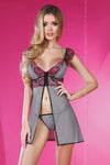 A stylish nightgown with hook-and-eye fastening. The babydoll-style cut opens slightly at the front, showing a part of the naked body. Deep décolletage is emphasized with fabulous, pink and black floral lace. The straps with frills, adjustable, look extremely luxurious. This is a woman's secret, perfect night lingerie! Thong free of charge.
