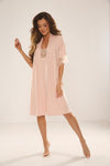 Women's bathrobe made of high quality viscose with elastane. Short bathrobe with binding at the waist, short sleeves. Cuffs finished with openwork lace.