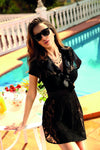 Lace dressing gown perfect for summer. With satin sleeves, which in this edition are short, comfortable and very feminine. As usual, the lace delights with its beautiful, floral pattern that sensually decorates the body. Neckline with a flirtatious little frill, bow tie at the back. Thong included.