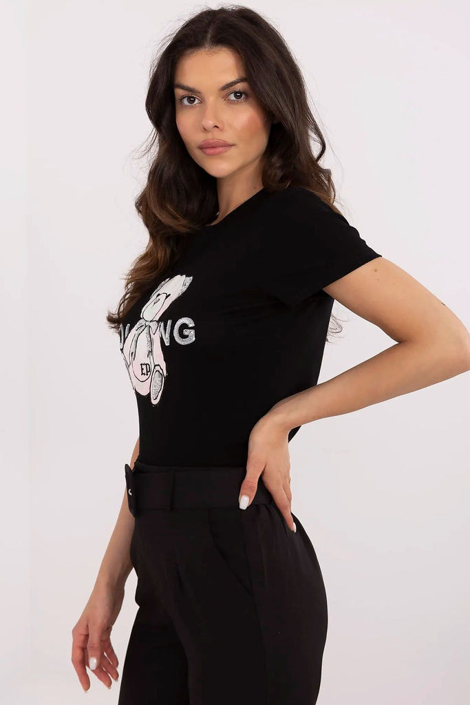 Charming and stylish women's t-shirt, perfect for everyday wear. Made of soft cotton with added elastane, it ensures comfort and great fit to the silhouette. The classic, round neckline and standard length make it suitable for many outfits. The short sleeve adds lightness, and original details, such as a bear-shaped embroidery with sequins, give it a unique character. This is the perfect choice for women who appreciate a casual style with trendy accents.