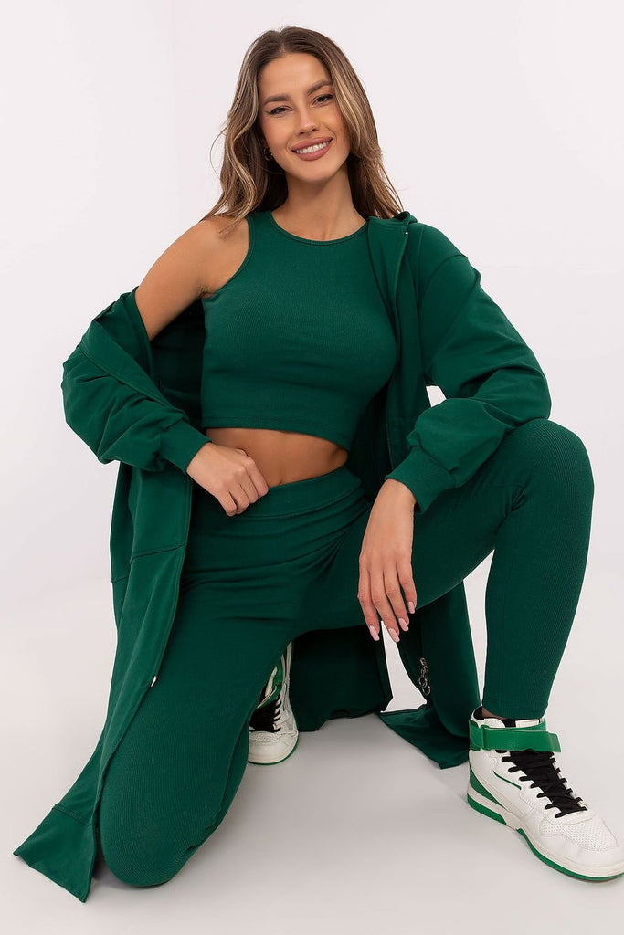 Women's set consisting of a hoodie, top, and leggings is a harmonious combination of casual and sporty style. Created with daily comfort and activity in mind, it will work perfectly both during training and relaxation. The hoodie with an extended cut is a practical solution for cooler days. Fastened with a zipper and equipped with slip pockets, it ensures comfort and functionality. Made of a blend of cotton, polyester, and elastane, it combines softness with elasticity. Long sleeves and a hood additionally protect against wind and cold. The top with a round neckline is simple yet universal, perfectly matched to the entire set. Its composition of cotton and elastane guarantees breathability and comfort. Leggings with tapered legs and a high waistline emphasize the silhouette, providing full freedom of movement. Made of cotton and elastane, they are characterized by elasticity and durability. An additional feature is the ribbed structure of the material, which gives them a unique character. The smooth pattern of the entire set fits perfectly into a daily, sporty look, offering both style and maximum comfort of use.