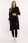 A women's set consisting of a hoodie, top, and leggings is a harmonious blend of casual and sporty style. Created with everyday comfort and activity in mind, it is perfect for both training and relaxation. The extended length hoodie is a practical solution for cooler days. Fastened with a zipper and equipped with slip pockets, it provides comfort and functionality. Made of a blend of cotton, polyester, and elastane, it combines softness with flexibility. The long sleeves and hood provide additional protection against wind and cold. The round-necked top is simple yet versatile, perfectly matched to the entire set. Its composition of cotton and elastane guarantees breathability and comfort. Leggings with tapered legs and a high waistline emphasize the silhouette, while providing full freedom of movement. Made of cotton and elastane, they are characterized by elasticity and durability. An additional feature is the ribbed structure of the material, giving them a unique character. The smooth pattern of the entire set fits perfectly into a daily sporty look, offering both style and maximum comfort of use.