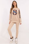 Women's set consisting of a sweatshirt and leggings is an excellent choice for everyday, casual stylizations. Ideal for women who value comfort, while wanting to look fashionable and stylish. The sweatshirt with a classic cut, round neckline, and long sleeves is made of a high-quality blend of cotton, polyester, and elastane. It is soft to the touch, elastic, and durable, ensuring comfort throughout the day. Subtle patches and embroidery on the sleeves and front give it a unique character, emphasizing the modern design. Leggings with tapered legs and a high waist are the perfect complement to the set. Made of cotton with a touch of elastane, they fit the silhouette perfectly, providing full freedom of movement and comfort. The set is kept in a smooth pattern, making it versatile and easy to match with various accessories. It is a perfect choice for everyday outings, relaxation, or activities in a casual style.