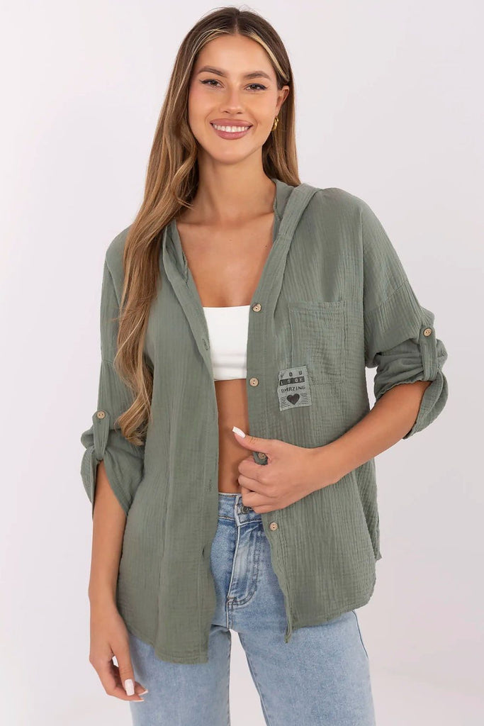 Casual women's shirt made of muslin cotton is the perfect choice for everyday stylizations. The light, airy and soft to the touch fabric provides comfort throughout the day, even on warmer days. The smooth texture of the material and classic cut make the shirt versatile and easy to style. A standard length model, buttoned up, with a practical hood that adds a sporty, casual character. Sleeves with the option of rolling up allow for adjusting the length depending on the weather and style. Additional details, such as patches and a chest pocket, give the shirt an original look and a light, streetwear accent. A great everyday proposition for jeans, shorts or leggings. Ideal for women who appreciate comfort and style in one.
