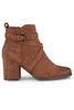 Booties made of organic suede leather. Fastened with a zipper on the inside. Set on a medium-height post. Around the ankle decorative crossed straps with a metal buckle. Lightly insulated inside. Comfortable, classic and very elegant boots will complement many autumn stylings.
