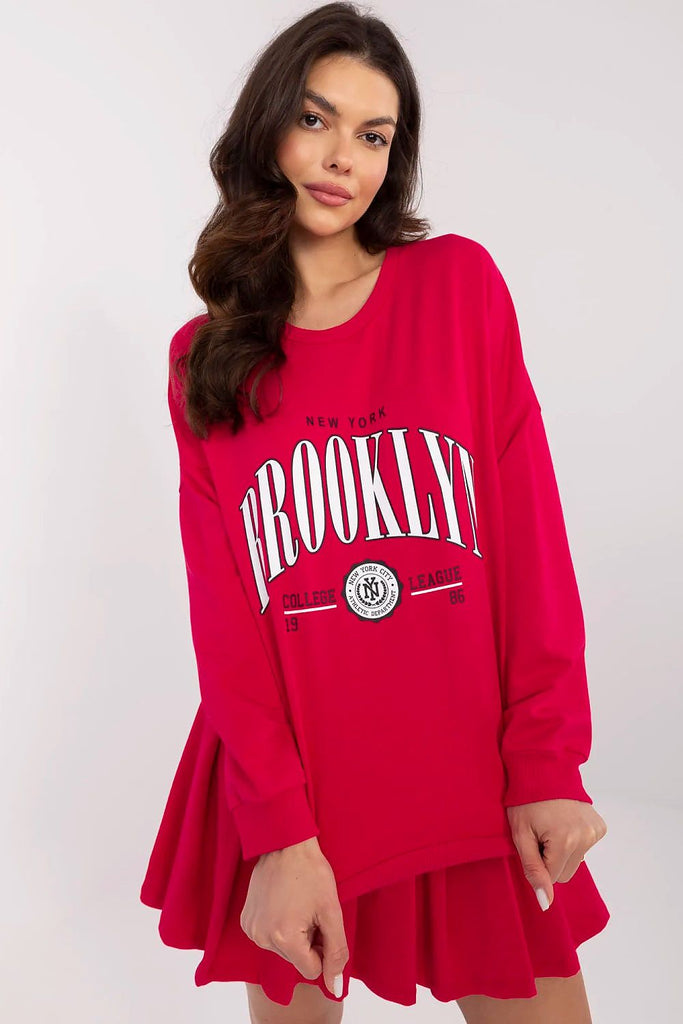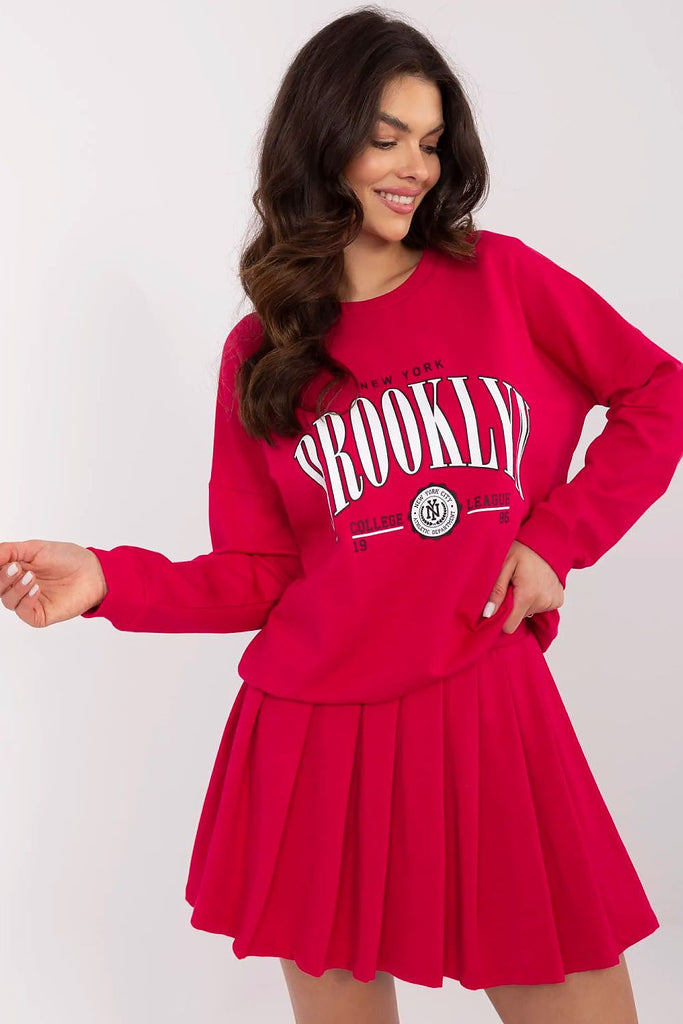 Casual women's set, perfect for everyday wear, combining style and comfort. Made of a soft blend of cotton and elastane, it provides comfort and perfect fit. The long-sleeved sweatshirt with a round neckline stands out with trendy prints on the front, giving the whole a modern character. The short pleated skirt with a high waist accentuates the silhouette, and the sewn-in shorts guarantee additional comfort and freedom of movement. An ideal choice for everyday sporty styling!