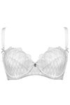 Seductive lingerie with soft cups in the color of classic white. The model perfectly collects and models the bust. The cups are decorated with subtle embroidery, the lower part is reinforced with elastic mesh.  The back is made of Lycra fabric, reinforced with vertical whalebone, perfectly supporting even a large bust. The straps are not detachable, but adjustable. Between the cups a jewelry decoration. Two-row hook and eye with three-step adjustment.