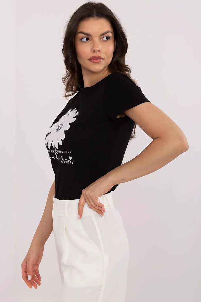 Stylish and feminine women's t-shirt, perfect for everyday wear. Made of high quality cotton with elastane, it provides comfort and breathability. The classic cut with standard length and round neckline makes it suitable for many stylizations. Short sleeves add lightness, and the decorative embroidery in the form of a flower with inscriptions, enriched with shiny sequins, gives the t-shirt a unique charm. This is a perfect choice for women who appreciate a casual style with a subtle, elegant accent.