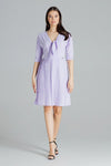 Purple spring midi dress in light airy fabric, kimono sleeve 3. V neckline, tied at the bust. Pleated bottom, fastened at the side with a covered zipper.