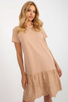 Summer cotton dress with short sleeves and a round neckline. Decorative ruffle at the bottom with an openwork pattern. Cotton 95 %...