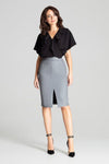 Grey eco-leather midi pencil skirt. Fastened at the front with a decorative clasp and at the back with a covered zip. No...