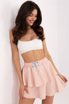 Light and girly flared mini skirt is the perfect choice for everyday wear. Made of a pleasant to the touch blend of polyester, elastane and viscose, it ensures comfort and freedom of movement. An elastic band is sewn into the waist, which adjusts to the silhouette and emphasizes the waist. An additional accent is a decorative patch placed on the front of the band. The model consists of two flounces, which add lightness and subtle charm to the whole. The smooth pattern and universal cut make the skirt perfect to pair with basic T-shirts as well as more elegant blouses. An excellent proposition for everyday casual stylizations.