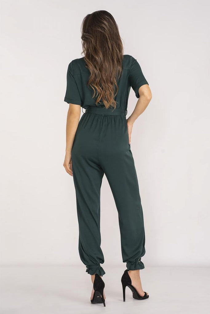 Comfortable and stylish jumpsuit with classic collar and envelope neckline. The elastic waistband and belt allow you to emphasize the waist. The model has short sleeves, making it ideal for summer outings. The suit has two side pockets and long legs finished with straps, so you can adjust the width. The product is made in Poland.