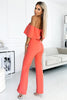 Peach-colored jumpsuit with ruffle and open shoulders. The top is sewn in a corset style with underwire. Fastened with a covered zipper...