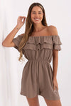 Light and airy muslin jumpsuit is the perfect choice for summer, everyday stylizations. Made of natural cotton, it guarantees comfort and even on hot days. The short sleeveless design beautifully exposes the legs and arms, and the off-shoulder neckline with a decorative ruffle adds feminine charm and summer casualness. There is an elastic band at the waist, which subtly emphasizes the waist and ensures a perfect fit to the silhouette. The model does not have a fastener, which makes it exceptionally comfortable and easy to put on. The smooth material combined with a simple form makes it a universal choice for everyday wear, perfect for a walk, the beach, or during holiday trips.