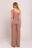 Elegant, asymmetrical jumpsuit with a motif on one shoulder, which catches the eye with its unique shape. Long sashes sewn to the sides give it lightness and a striking character, allowing for interesting styling. Slightly flared legs provide comfort and an elegant look. The model fastens with a concealed zipper on the side, ensuring a perfect fit. The whole design and made in Poland with the highest attention to detail, combining modernity with classic style.