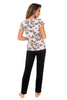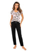 Consisting of a short-sleeved T-shirt and long pants, AISHA pajamas. Light pink shirt, decorated with floral motifs in oriental style. The neckline is small, trimmed with thin lace, Short sleeve gently falling. Pants uniformly black, loose, made of soft viscose, at the waist decorated with a satin bow. The whole is a perfect, expressive composition. Made in Poland.