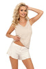 The warm soft sand color of the T-shirt combined with the white and beige stripes of the pants encourages joy and positivity. The top has a wide shoulder strap and a sweetheart neckline. Shorts comfortable with a clearly accentuated frill. A model suitable for every day and every occasion. Made in Poland.