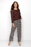 Women's pajamas that combine elegance with comfort. A long-sleeved blouse with a semi-circular neckline and subtle, feminine styling will work great not only as sleepwear, but also as stylish homewear. Made of soft, breathable fabric with a quilted texture, it ensures comfort throughout the day. Pants with long legs and a loose, comfortable cut are the perfect complement to the set. Thanks to the elastic waistband, they adapt to the silhouette, offering freedom of movement. The pajamas stand out with subdued colors and high-quality materials, giving them an elegant look. This is an excellent choice for women who value comfort and style in the comfort of their own home.