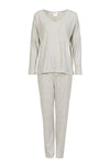 Women's two-piece pajamas that combine elegance with maximum comfort. The long-sleeved V-neck blouse is designed in a loose oversize cut, making it a perfect choice for women with a larger bust, providing freedom and comfort. The smooth fabric in delicate colors adds subtlety and class, making the pajamas also suitable as stylish homewear. The pants with long, fitted slim legs emphasize the silhouette, and the elastic waistband ensures a perfect fit for any figure. The lack of pockets gives them a minimalist character. The high-quality delicate material guarantees durability and pleasure of use, creating a harmonious whole with the blouse. The sleek cut and regular fit make this set the perfect choice for women who value comfort, style, and versatility.