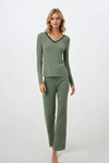 Two-piece pajama designed with elegance and comfort in mind. The V-neck, subtly finished with lace, adds feminine charm and lightness to it. The delicate color scheme and smooth fabric create a harmonious whole, perfect for rest and relaxation. The top of the pajamas with long sleeves finished with an elegant cuff provides comfort and style, while the pants without pockets, in a straight cut and with an elastic waistband, guarantee comfort and freedom of movement. The long pants provide comfort on cooler nights, and the soft and breathable fabric made of delicate viscose ensures a feeling of lightness and comfort throughout the night. The pajamas are designed and sewn in Poland from the highest quality materials, making them an excellent choice as a gift or as elegant homewear.
